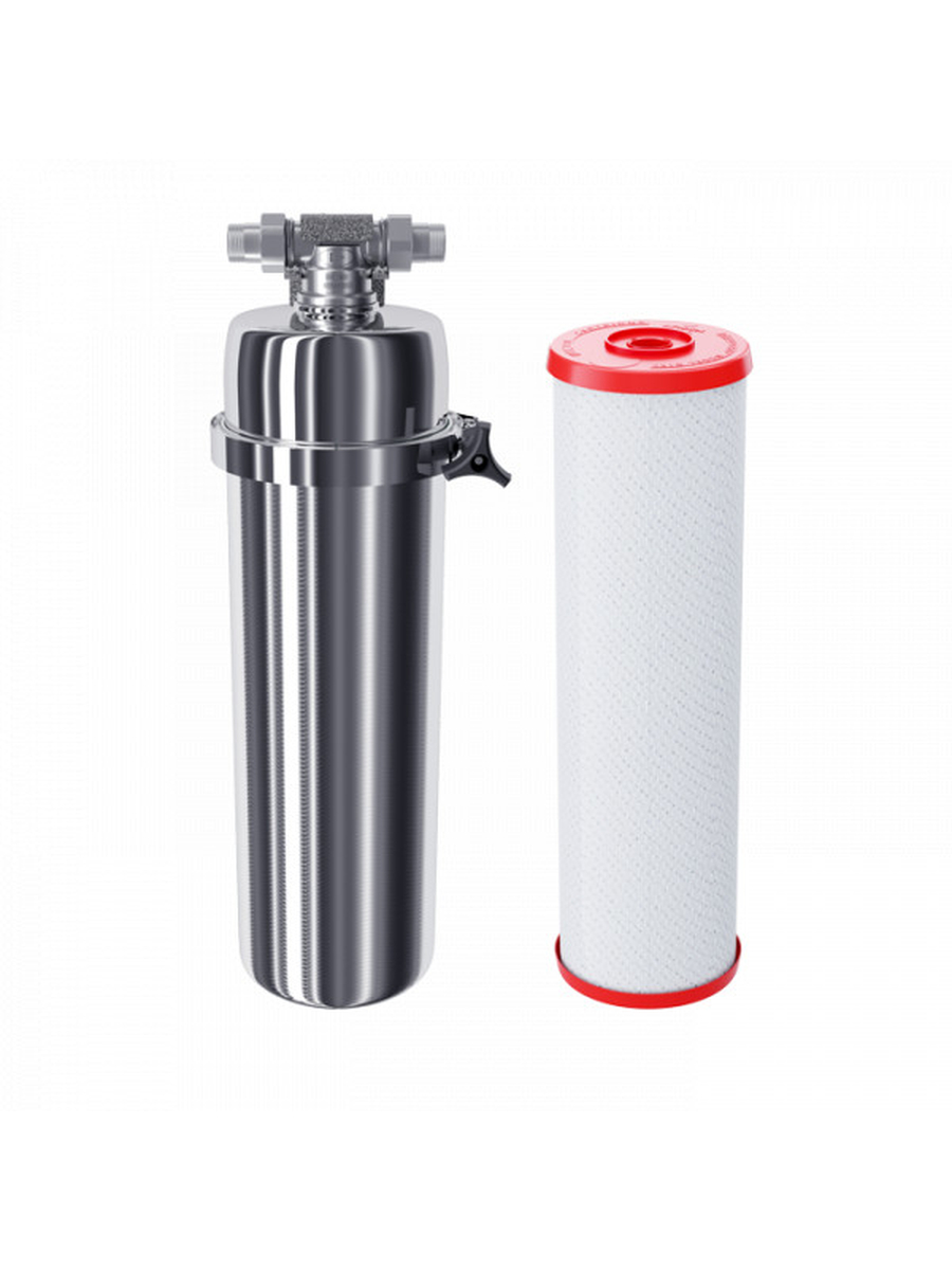 Металлический корпус фильтра выглядит лаконично и стильно, прекрасно дополняя интерьер ванной комнаты, если невозможно спрятать его в шкафчик или другое укрытие. Нижняя часть корпуса выполнена из нержавеющей стали марки AISI 316, которая отличается повышенной устойчивостью к коррозии и механическим нагрузкам, выдерживает сильное давление до 20 атмосфер и готова служить не менее 10 лет.