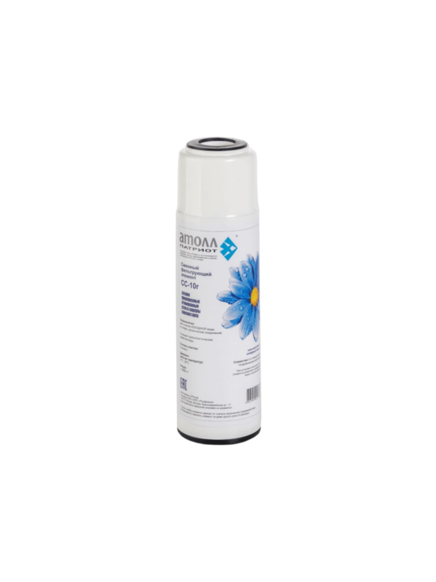 Картридж atoll CC-10r Патриот предназначен для очистки холодной воды от посторонних запахов и привкусов. Выполнен из гранулированного активированного угля, помещенного в пластиковый корпус. Совместим с фильтрующими корпусами стандартного размера SL10, что делает его подходящим вариантом для бытовых фильтров питьевой воды.