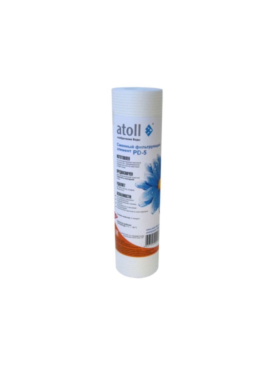 Картридж atoll PD-5 предназначен для эффективной фильтрации горячей и холодной воды от твердых частиц размером более 5 микрон. Изготовлен из вспененного полипропилена, устойчивого к высоким температурам, что позволяет использовать его как для холодной, так и для горячей воды. Усилен жестким полипропиленовым сердечником, что обеспечивает высокую прочность и долговечность. Совместим с корпусами стандартного размера SL10, что делает его универсальным решением для бытовых и коммерческих фильтров. Хорошо зарекомендовал себя в системах предварительной очистки воды, обеспечивая надежную защиту последующих ступеней фильтрации от преждевременного износа.