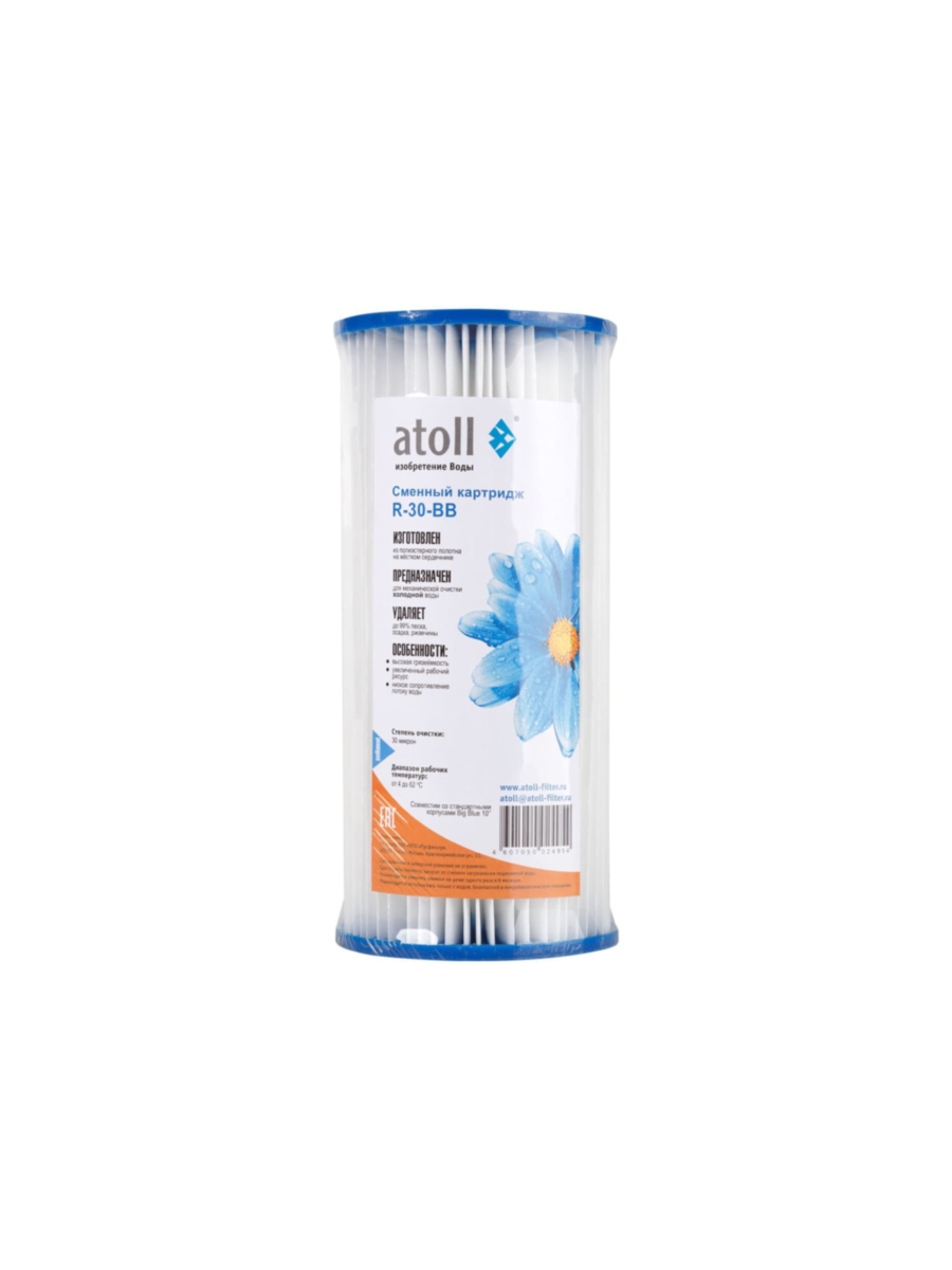 Картридж atoll R-30-BB предназначен для фильтрации холодной воды от твердых частиц крупнее 30 микрон. Изготовлен из лепестковой структуры гофрированного полиэстера, что обеспечивает эффективную задержку загрязнений. Совместим с корпусами стандартного размера BB10, используемыми в бытовых и промышленных фильтрах.