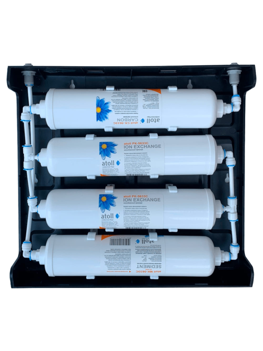 - На последнем этапе расположен сорбционный картридж atoll CK-5633C, выполняющий удаление хлора и органических соединений, повышая качество напитков и пищи.