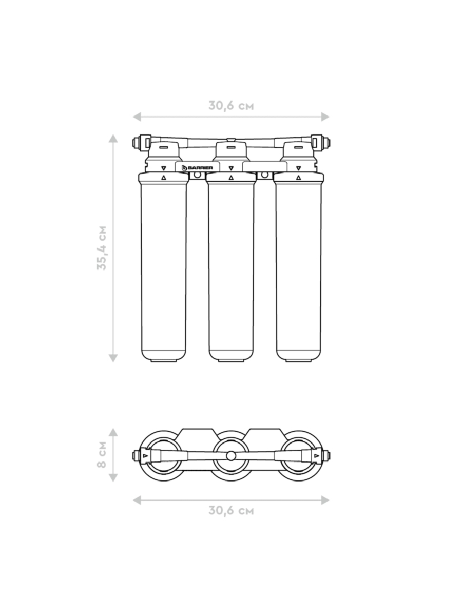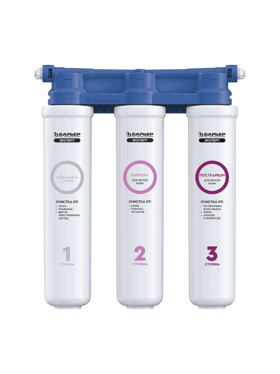Система фильтрации Барьер Эксперт Слим для мягкой воды включает три отдельных фильтрующих элемента: