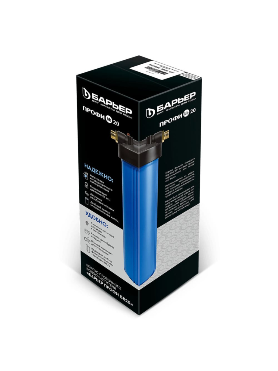 Корпус магистрального фильтра Барьер Профи BB20 G1 выполнен из непрозрачного пластика и предназначен для установки сменных картриджей стандарта Big Blue 20.