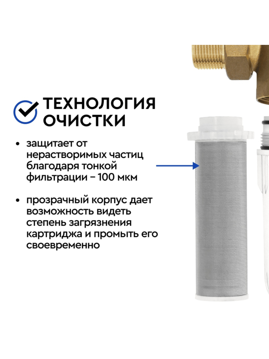 - Оснащён прочной прозрачной пластиковой колбой, позволяющей визуально контролировать степень загрязнения фильтрующей сетки и своевременно предпринимать меры по её очистке. Колба выдерживает входящее давление до 20 атмосфер, что гарантирует долговечность и надёжность фильтра даже в условиях нестабильного давления в водопроводной системе.