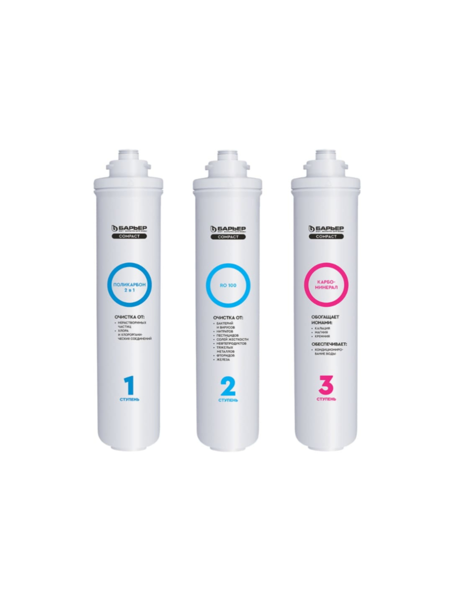 - Барьер Compact Карбоминерал — картридж, обогащающий воду кальцием и магнием, улучшая её вкус и восстанавливая минеральный баланс.