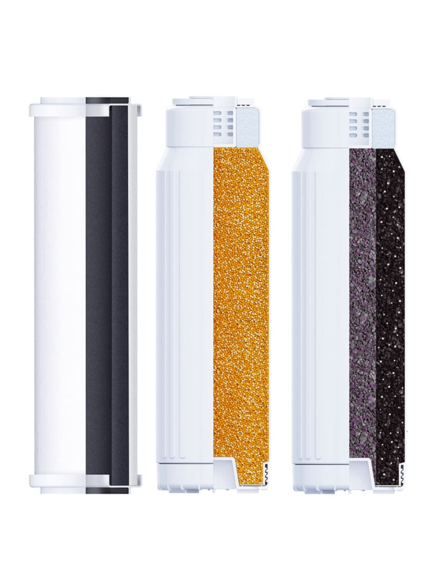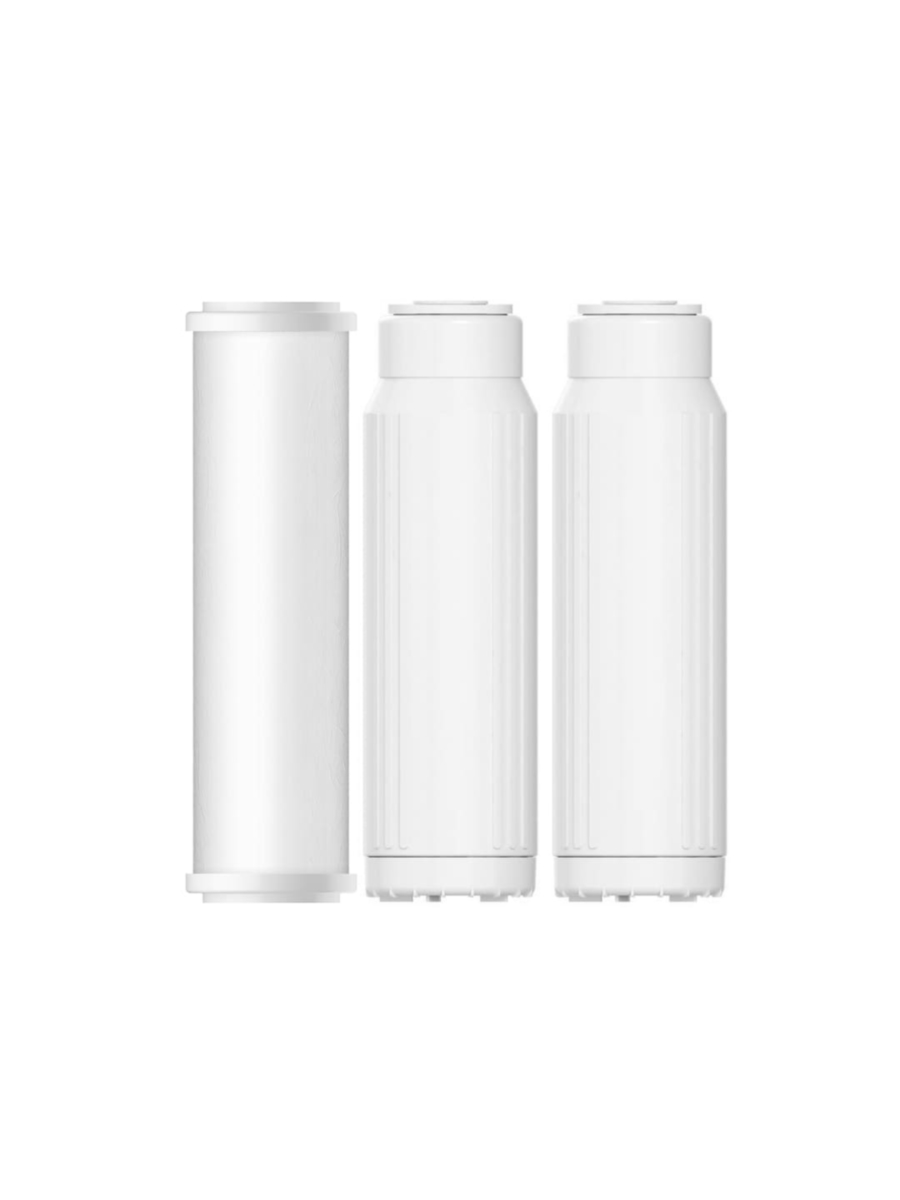 Комплект состоит из трех картриджей, обеспечивающих последовательную очистку воды:
