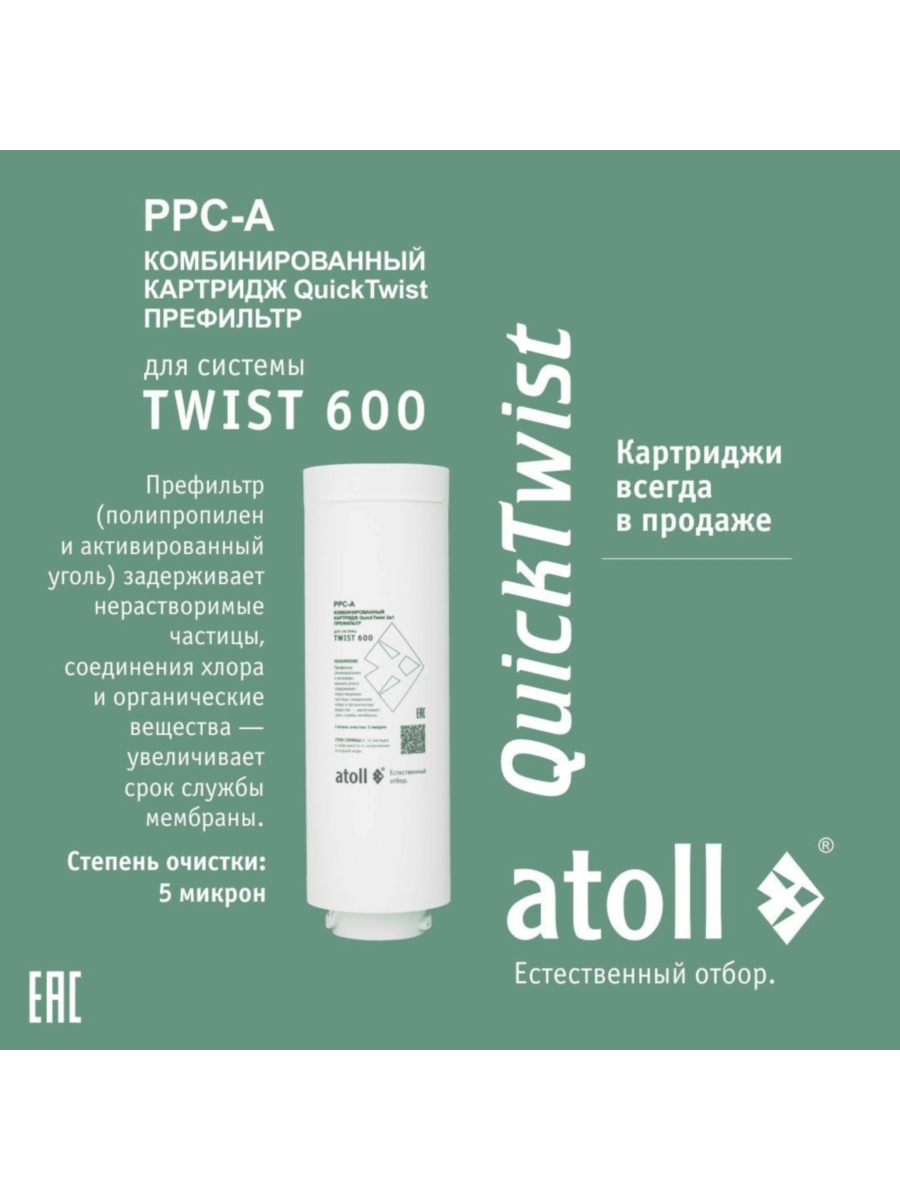 - Картридж atoll PPC-A TWIST – менять каждые 6-12 месяцев в зависимости от качества воды.