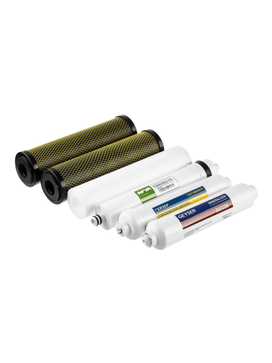 В комплект Гейзер RO3 входят шесть сменных картриджей, которые устанавливаются в систему в следующем порядке: