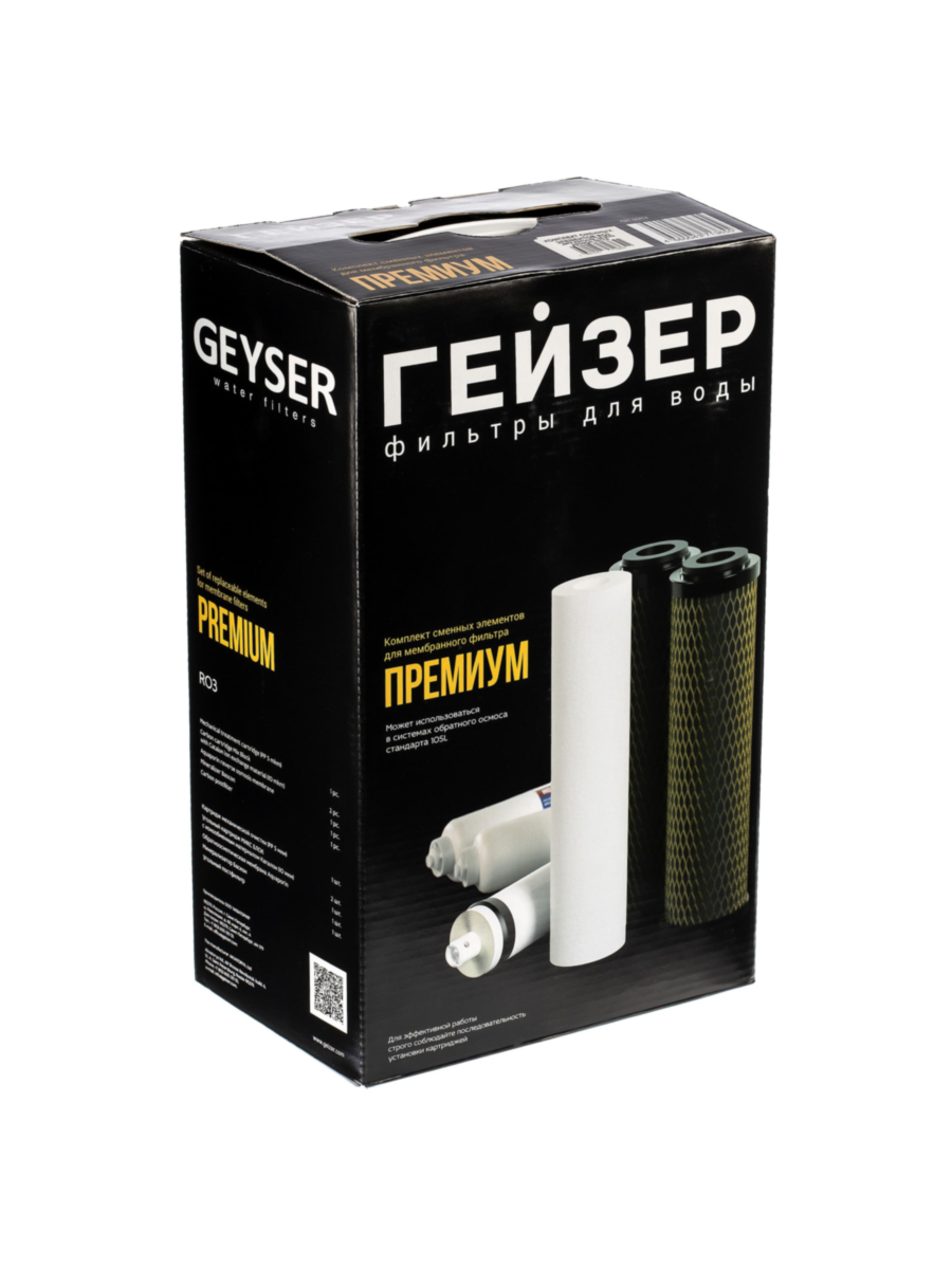 Комплект сменных картриджей Гейзер RO3 предназначен для обслуживания шестиступенчатых систем обратного осмоса премиум-серии. Он обеспечивает глубокую очистку воды, насыщение ее полезными элементами и улучшение вкусовых качеств.