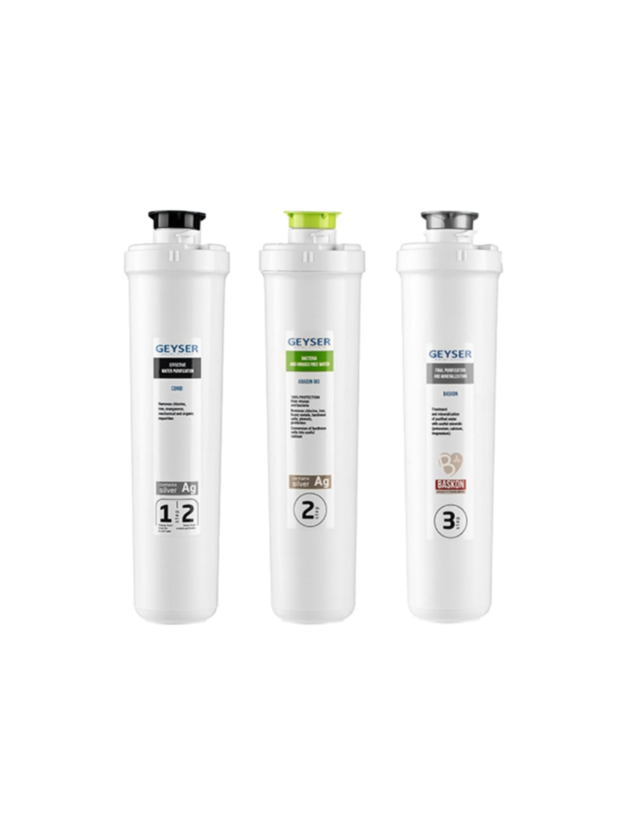 Набор собран из трех сменных картриджей Гейзер, устанавливаемых в фильтре Смарт Био 511 в следующей последовательности:
