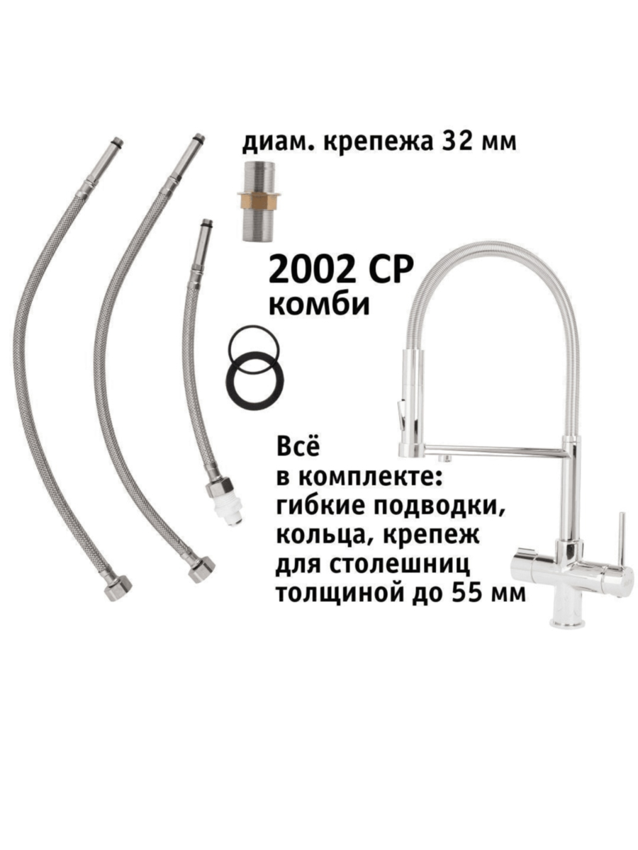 - комплектация — смеситель, гибкая подводка 1/2″, переходник для подключения к фильтру, прокладки, резьбовая втулка, гайка.