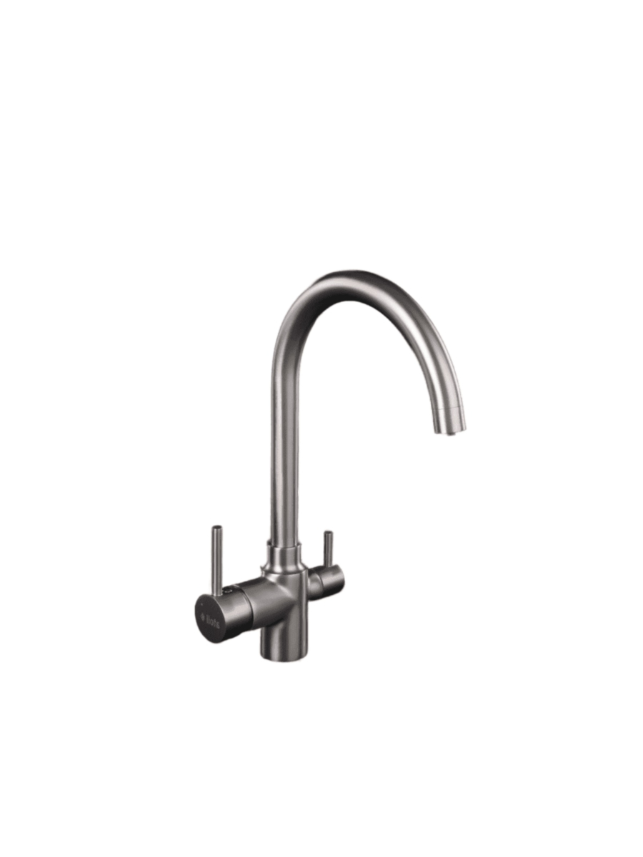 - тройная функциональность — один смеситель для трёх потоков воды (холодной, горячей, фильтрованной), что экономит место на кухне;