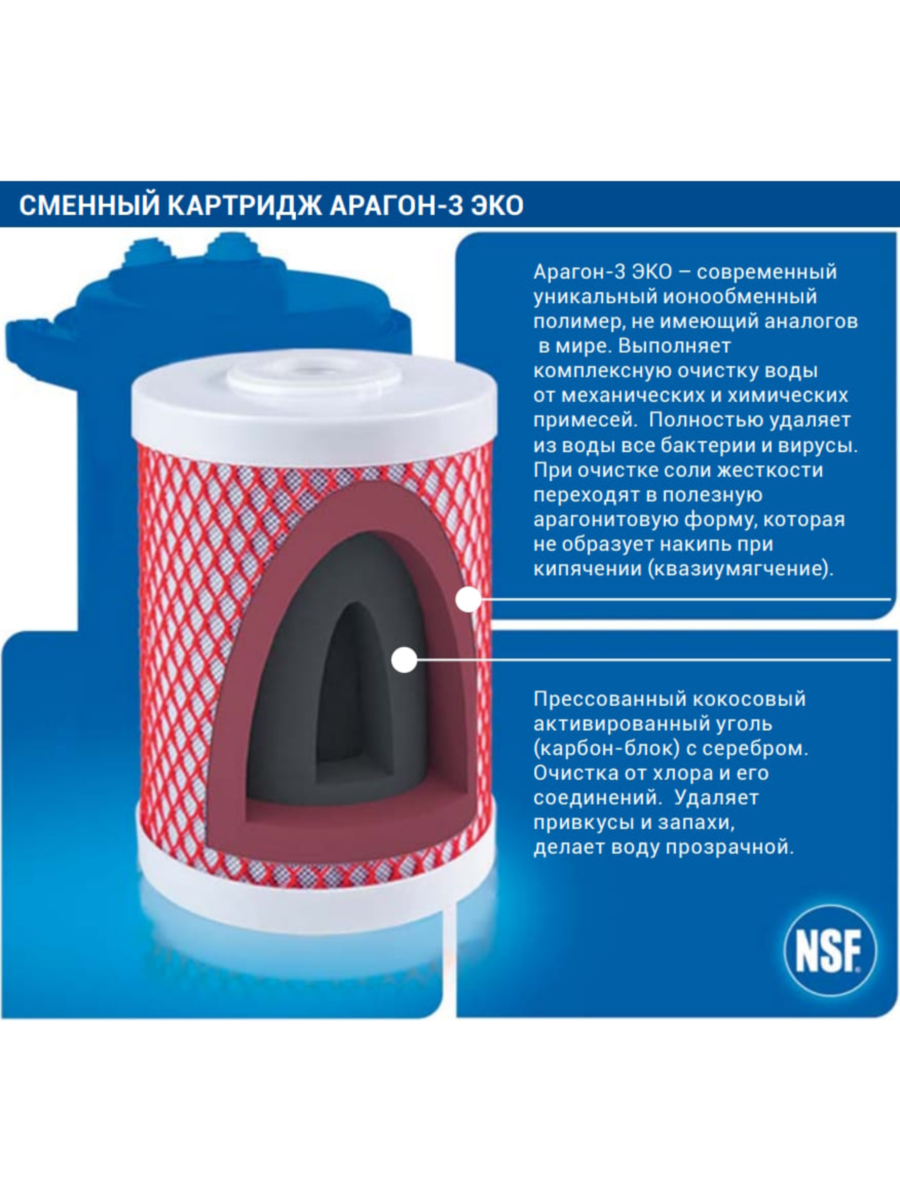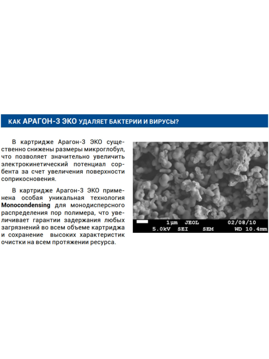 - Второй слой — микропористый ионообменный материал Арагон, удаляющий бактерии, вирусы, токсины, тяжелые металлы, нефтепродукты, мелкие частицы железа и прочие загрязнения размером более 0.1 мкм.