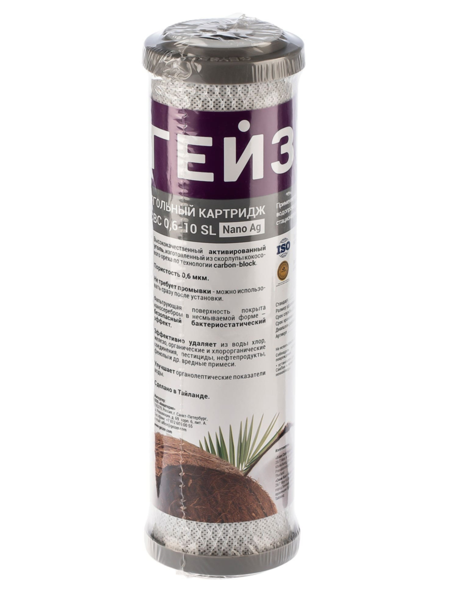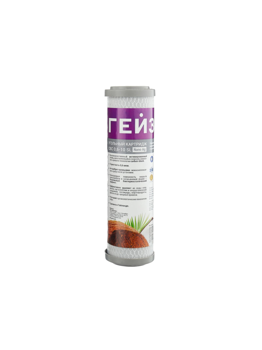 Эффективный угольный картридж Гейзер CBC 0.6-10SL Ag обеспечивает тщательную очистку питьевой воды, нейтрализуя посторонние запахи и улучшив её вкусовые свойства.