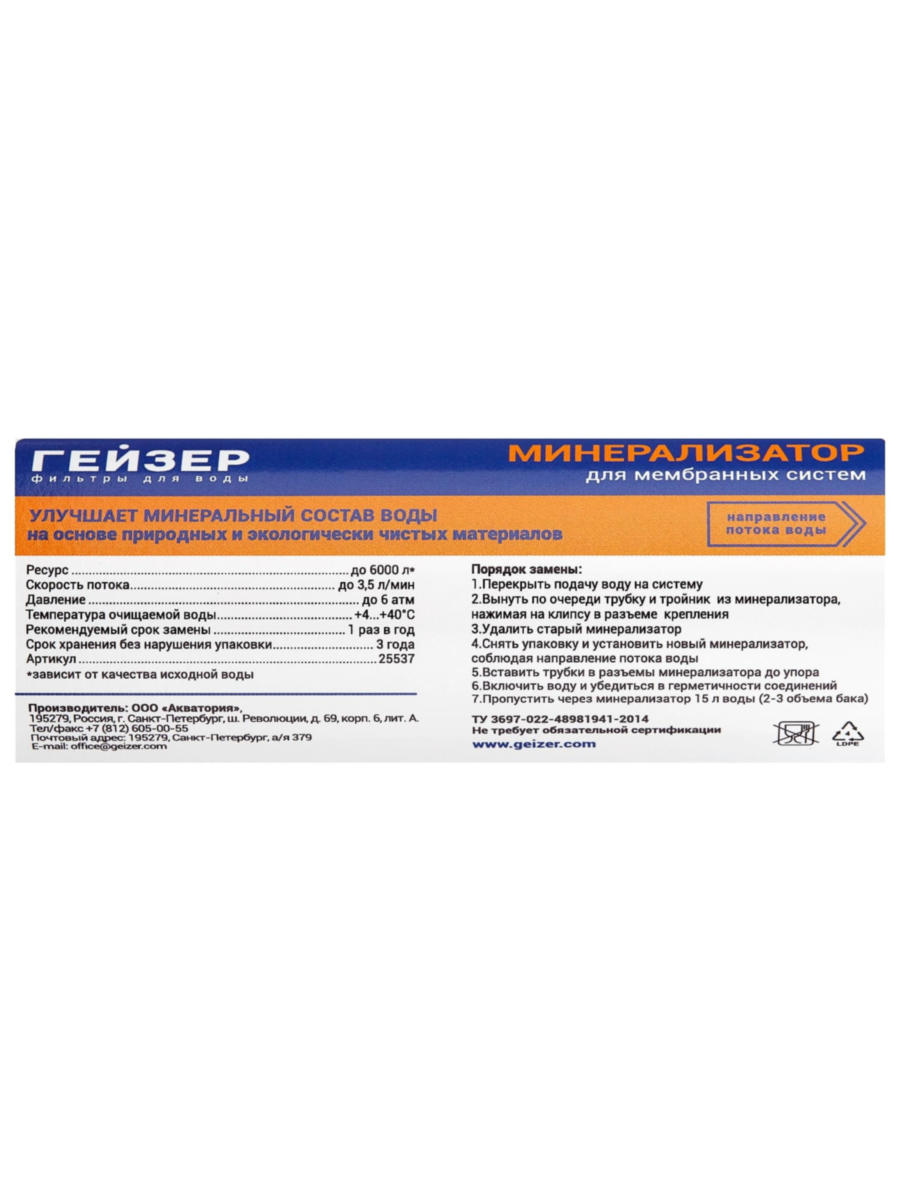 Гейзер В (RO) — это специальный картридж, предназначенный для восстановления естественного минерального состава воды, прошедшей очистку методом обратного осмоса. Данный продукт обогащает воду необходимым количеством кальция и магния, делая её полезной и приятной на вкус.