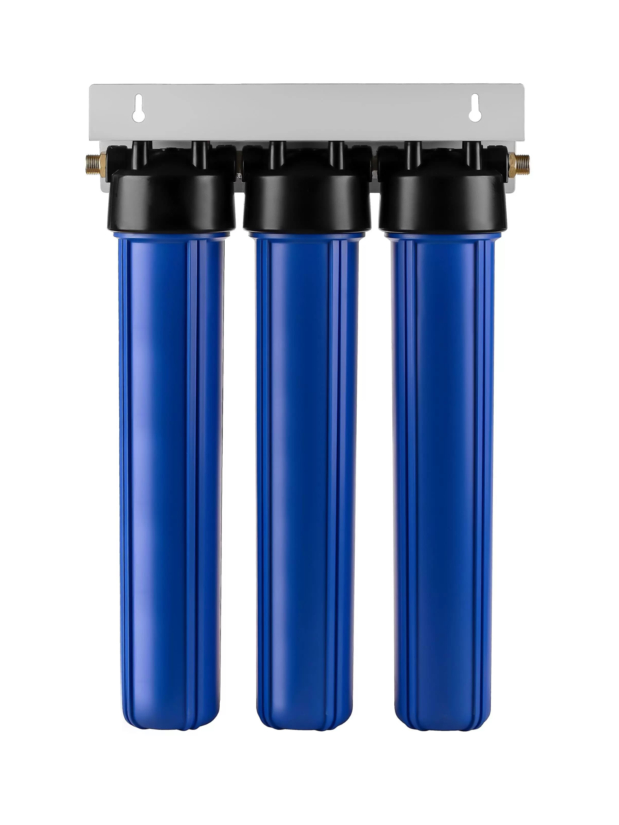 - Конструкция фильтра состоит из трех пластиковых колб стандарта Slim Line 20, что обеспечивает компактность и простоту установки.