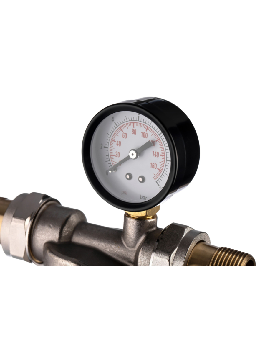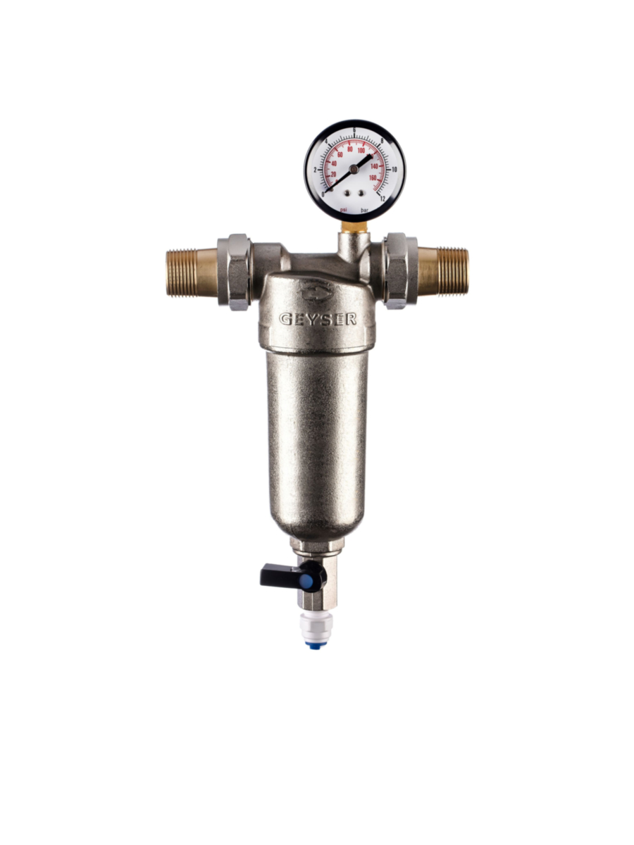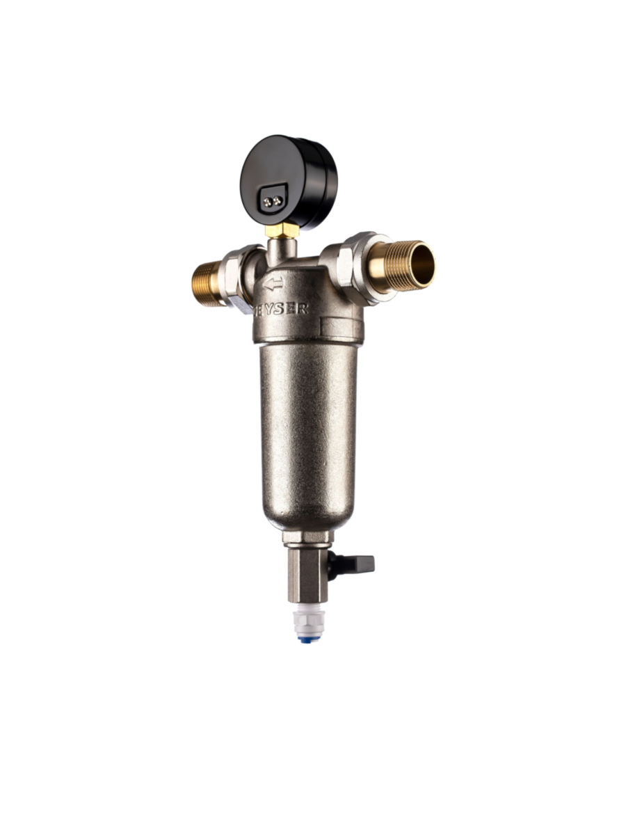 - В комплект поставки входят радиальный манометр и фитинги с наружной резьбой 3/4 дюйма, что упрощает монтаж и подключение фильтра к водопроводу.