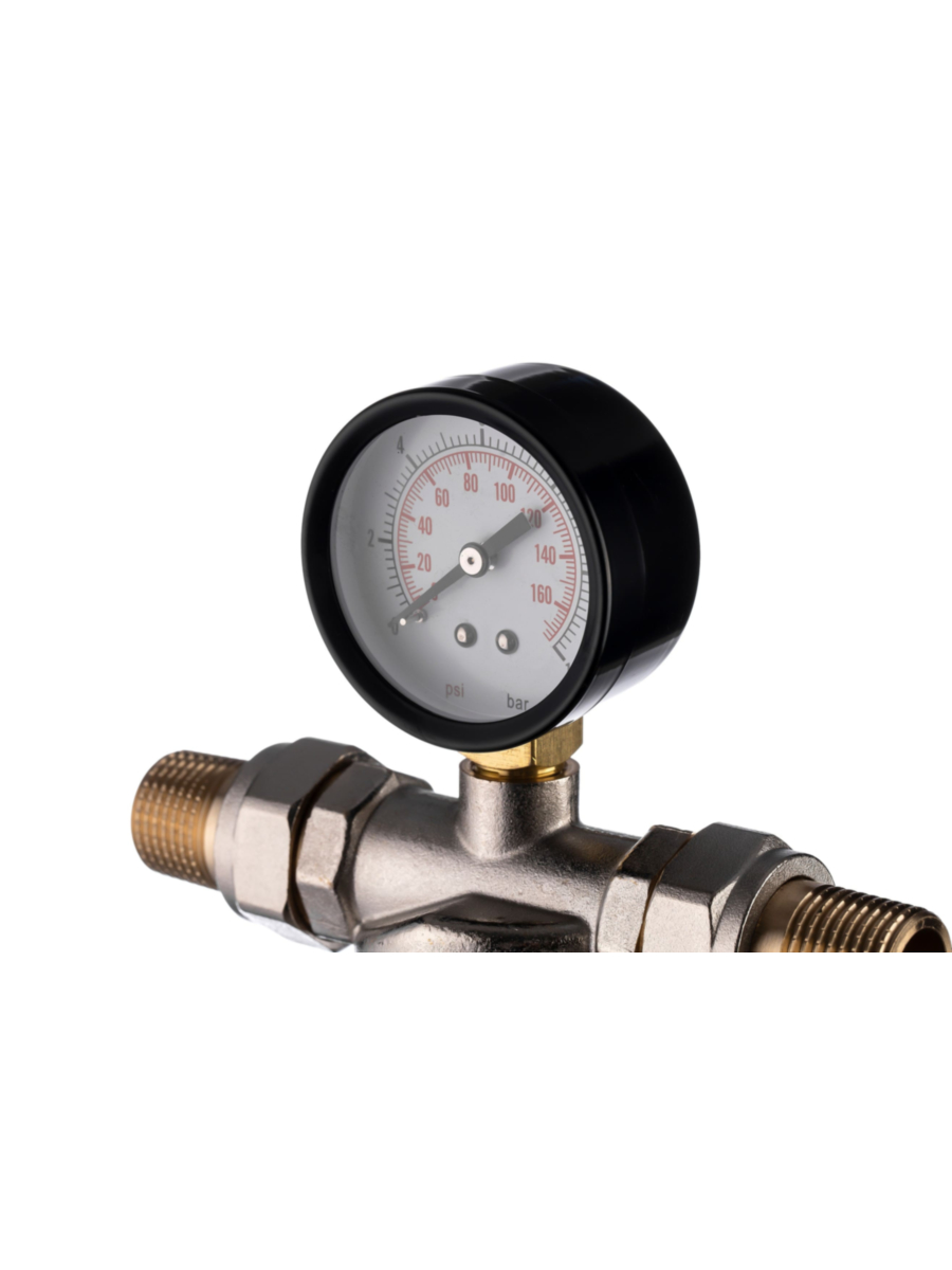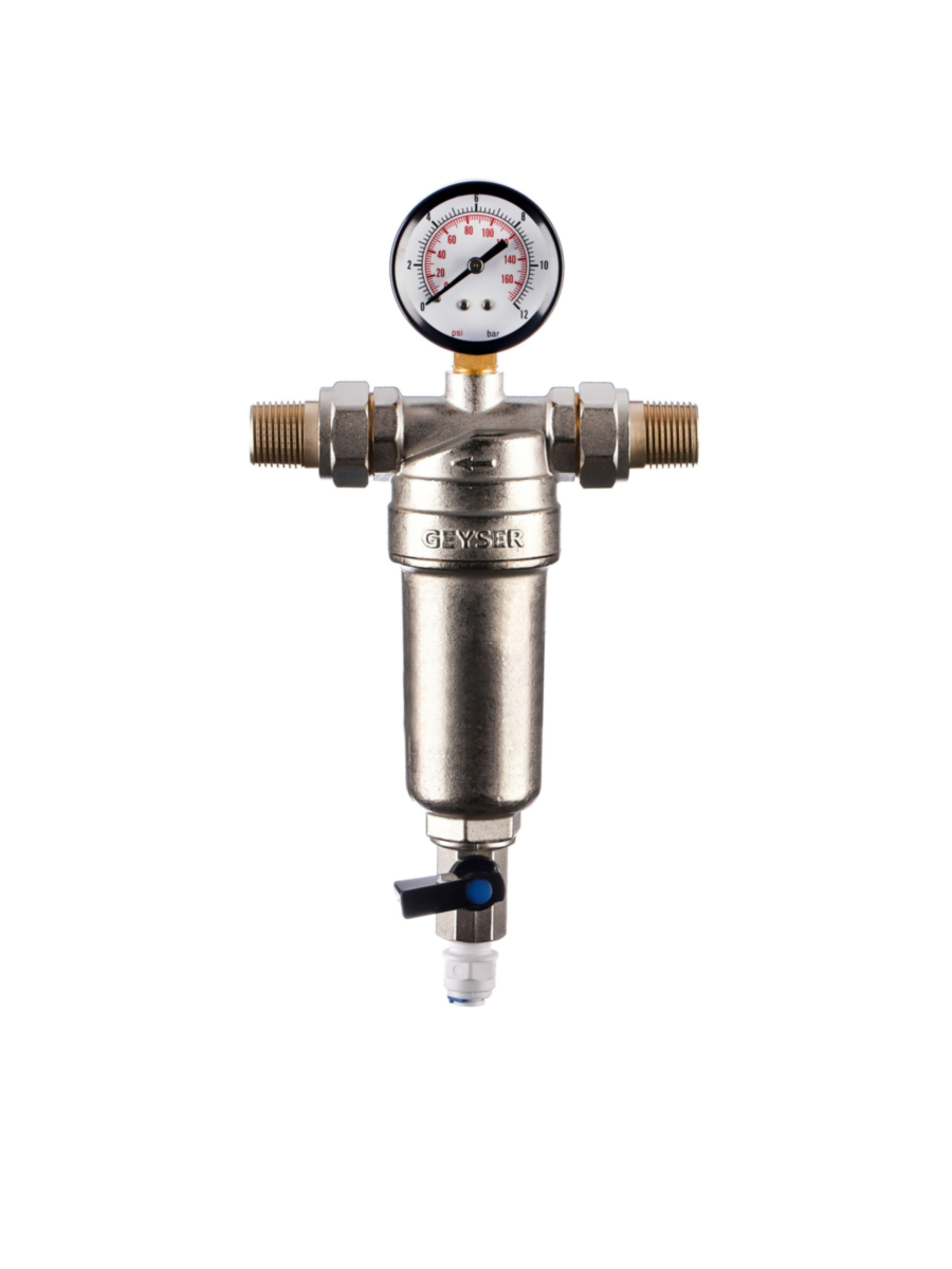 - В комплект поставки входят радиальный манометр и фитинги с наружной резьбой 1/2 дюйма, обеспечивающие удобную установку и надежное подключение фильтра к водопроводу.