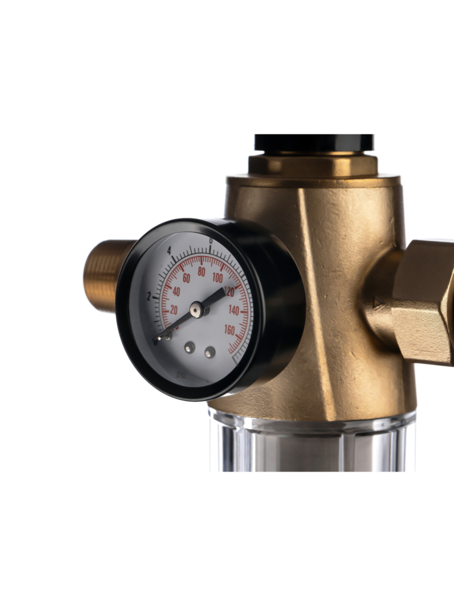 - В комплект поставки входят манометр, ключ для замены колбы и соединительные фитинги с наружной резьбой 3/4 дюйма, что упрощает монтаж и эксплуатацию фильтра.