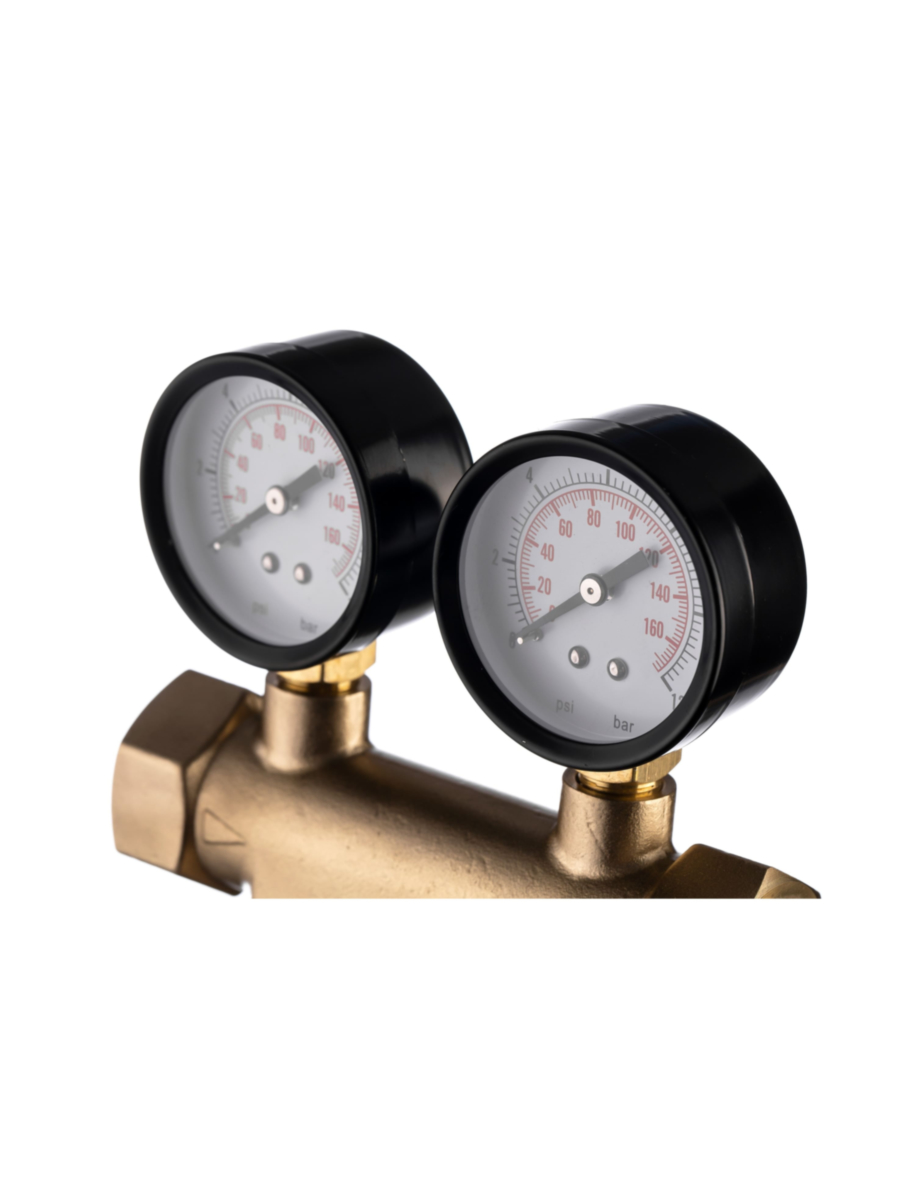 - Оборудован двумя манометрами, отображающими давление воды на входе и выходе из фильтра, что позволяет своевременно обнаружить признаки забивки сетки и приступить к процедуре промывки.