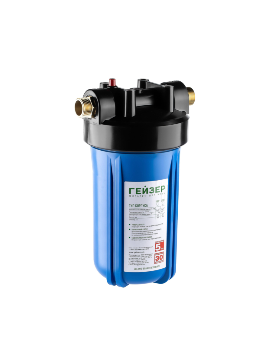 Надежный корпус магистрального фильтра Гейзер BB10 предназначен для эффективной очистки воды в автономных и централизованных системах водоснабжения.