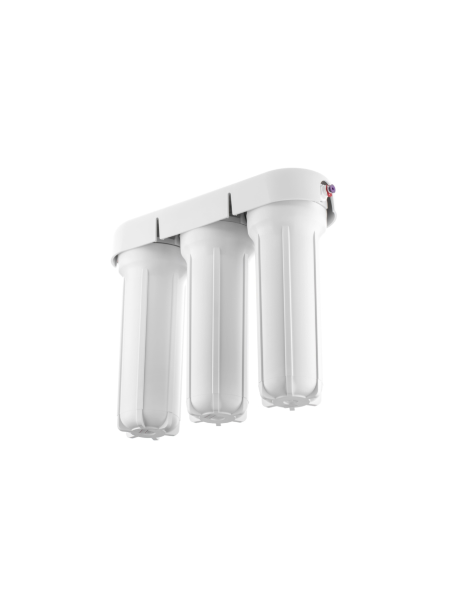 - Корпус фильтра выполнен из трех пластиковых колб стандартного размера Slim Line 10, что обеспечивает компактность и эстетичный внешний вид.