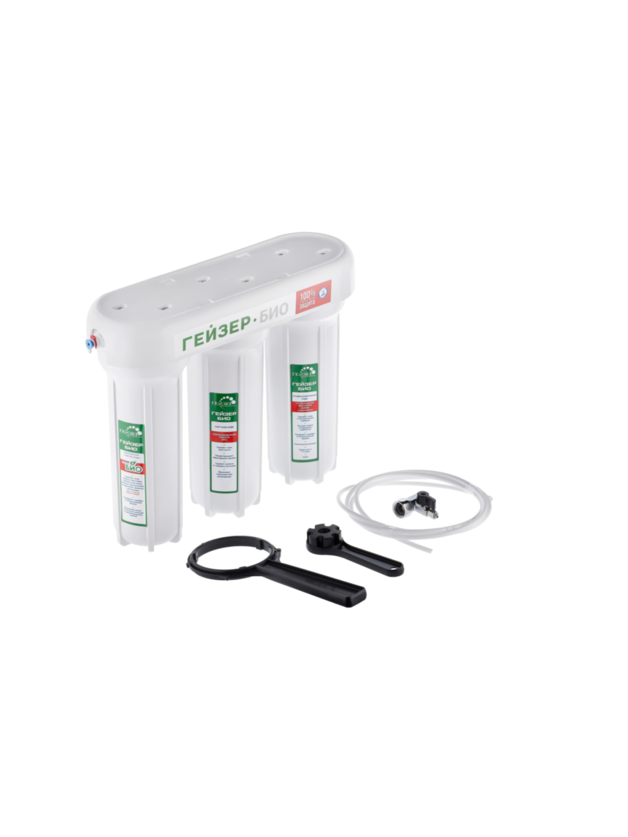 Гейзер Био 331 — это полноценная система фильтрации воды, предназначенная для комплексной очистки жидкостей с высоким содержанием солей жесткости. Она оснащена теми же фильтрующими элементами, что и модель с краном, но поставляется без него, что делает её выгодной покупкой для тех, у кого уже установлен трехпоточный смеситель с дополнительным выходом для питьевой воды.