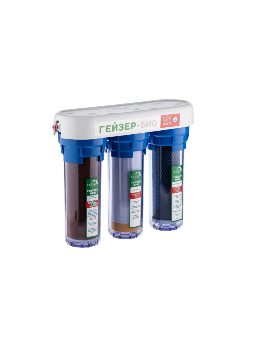 Фильтр Гейзер БИО 332 комплектуется тремя сменными картриджами, установленными в определенной последовательности: