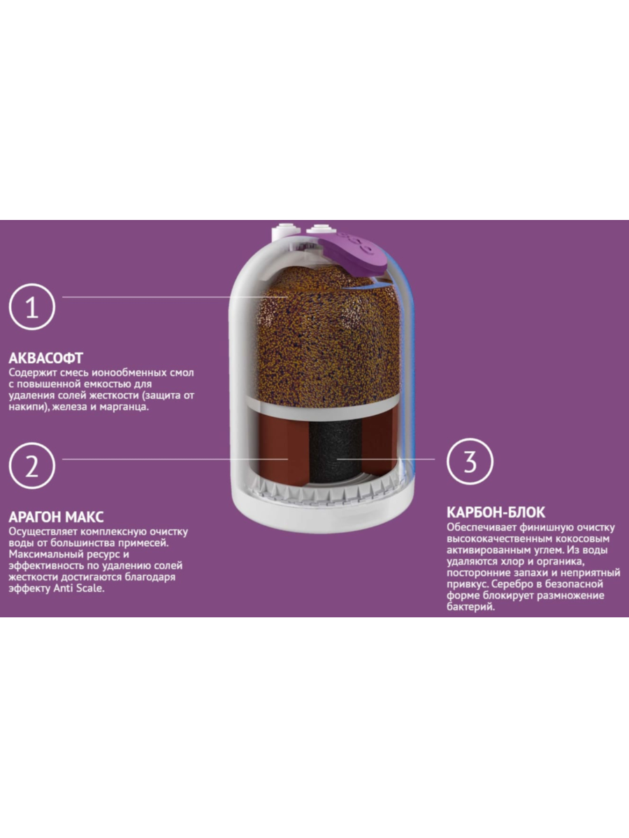 - Использует комбинированную фильтрующую загрузку, состоящую из ионообменной смолы Аквасофт, фильтроматериала Арагон Макс и активированного угля, что обеспечивает эффективное удаление загрязнений и улучшение качества воды.