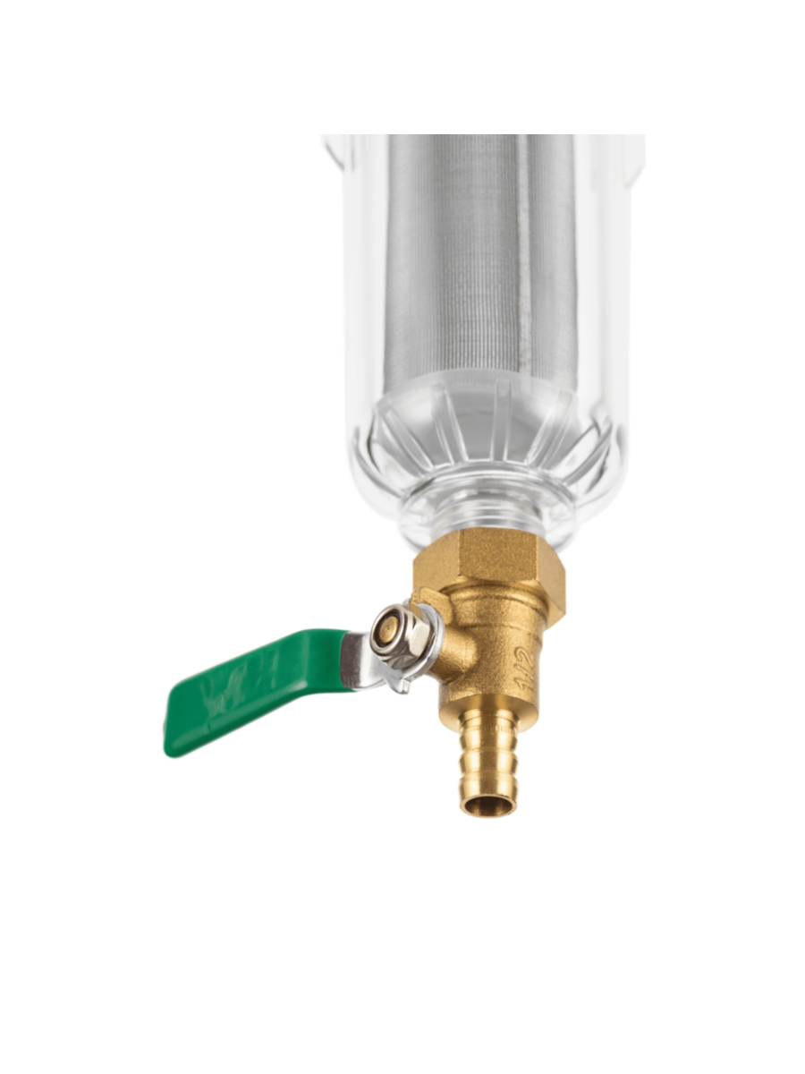 - Прозрачная колба фильтра позволяет визуально оценить степень загрязнения сетки и своевременно провести промывку или замену фильтрующего элемента.