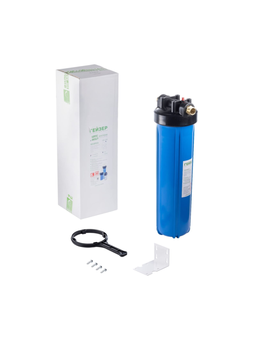 - В комплект поставки входят ключ для колбы и кронштейн для настенного монтажа, что позволяет удобно закрепить фильтр в выбранном месте и упростить его обслуживание.