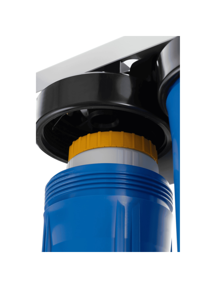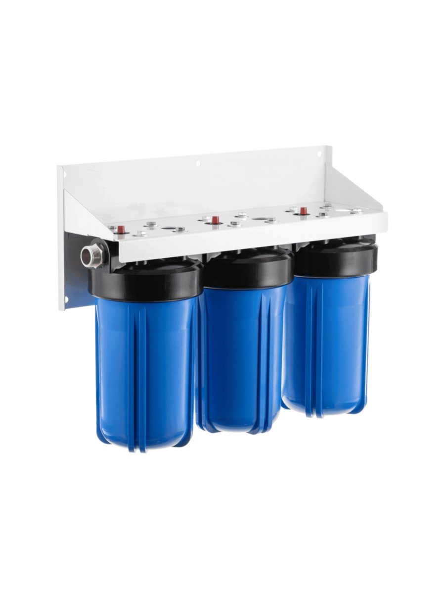 - Фильтр состоит из трех пластиковых колб формата Big Blue 10, закрепленных на металлическом кронштейне, что обеспечивает компактность и удобство монтажа.