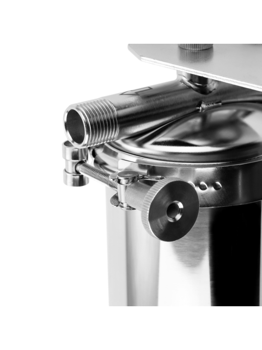 - Колба соединяется с крышкой посредством хомута, что позволяет осуществлять замену фильтрующего элемента без использования инструментов, значительно ускоряя процесс обслуживания.