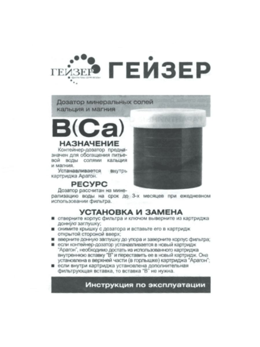 Специальный препарат для минерализации мягкой питьевой воды, позволяющий обогатить её жизненно важными солями кальция и магния. Минерализатор Гейзер-В (Ca) рекомендован для использования с картриджами: