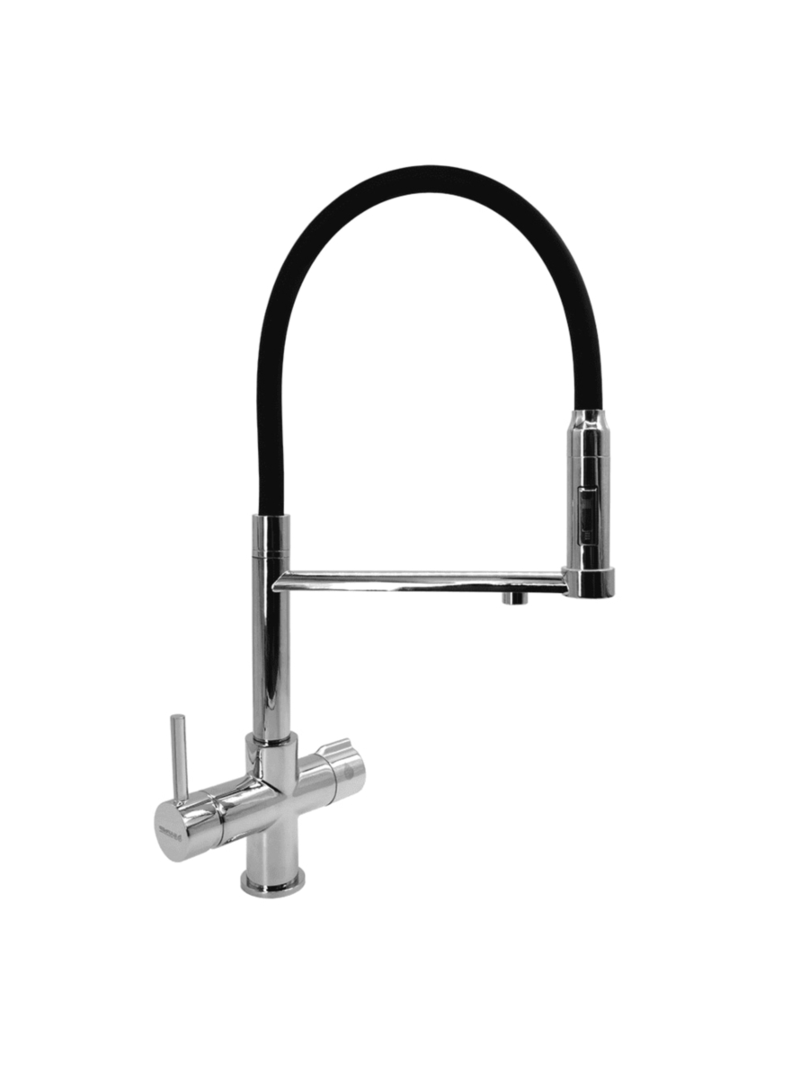 Смеситель оснащен отдельным краном для подачи питьевой воды, очищенной фильтром, установленным под мойкой. Это позволяет получать чистую и безопасную воду прямо на кухне, не прибегая к покупке бутилированной воды. Корпус смесителя выполнен в современном дизайне, а черный излив добавляет особого стиля и контраста.