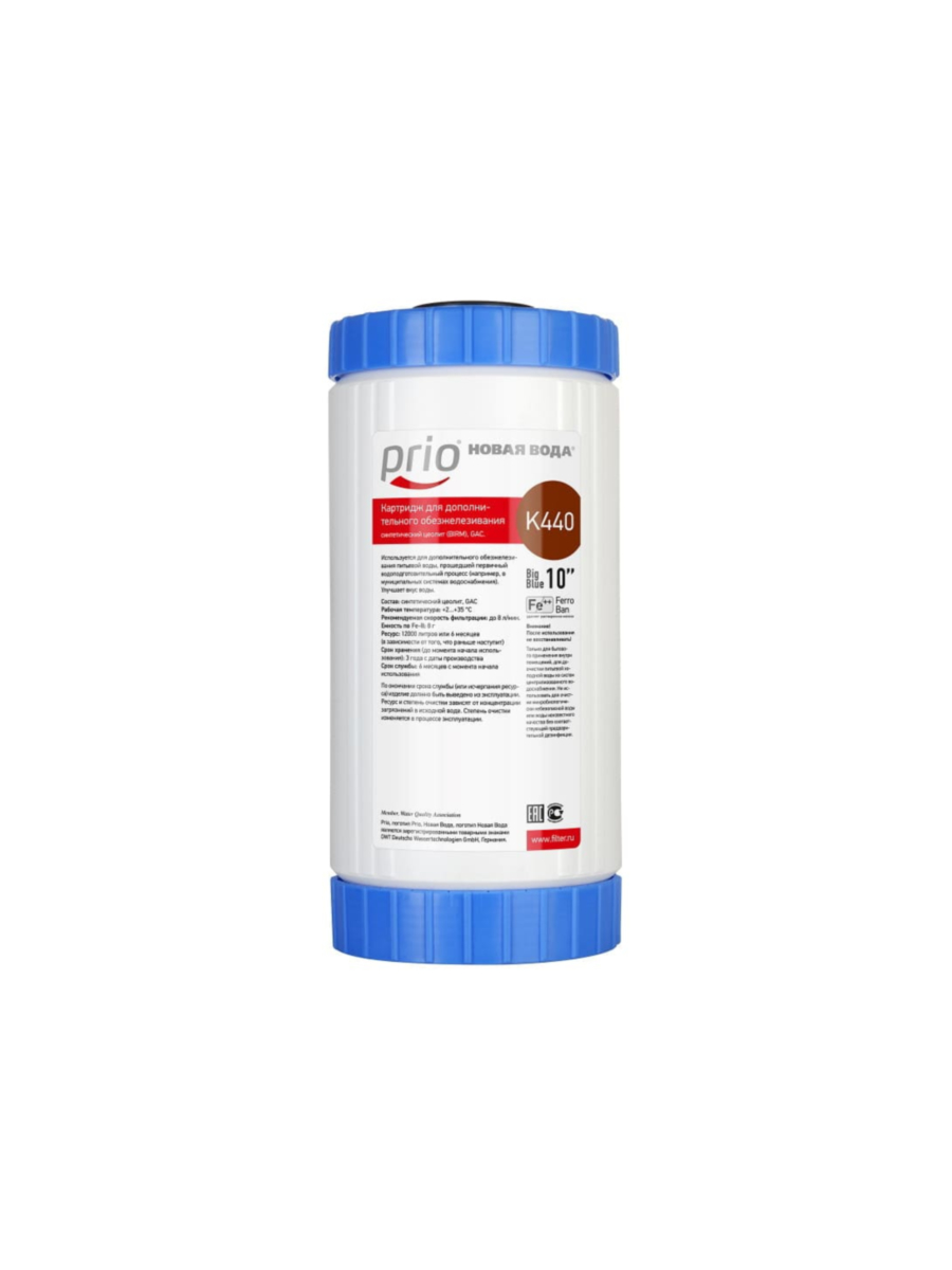 Картридж Prio Новая Вода K440 рекомендуется для доочистки железистой водопроводной воды из муниципальных систем водоснабжения, обеспечивая высокое качество и безопасность воды.