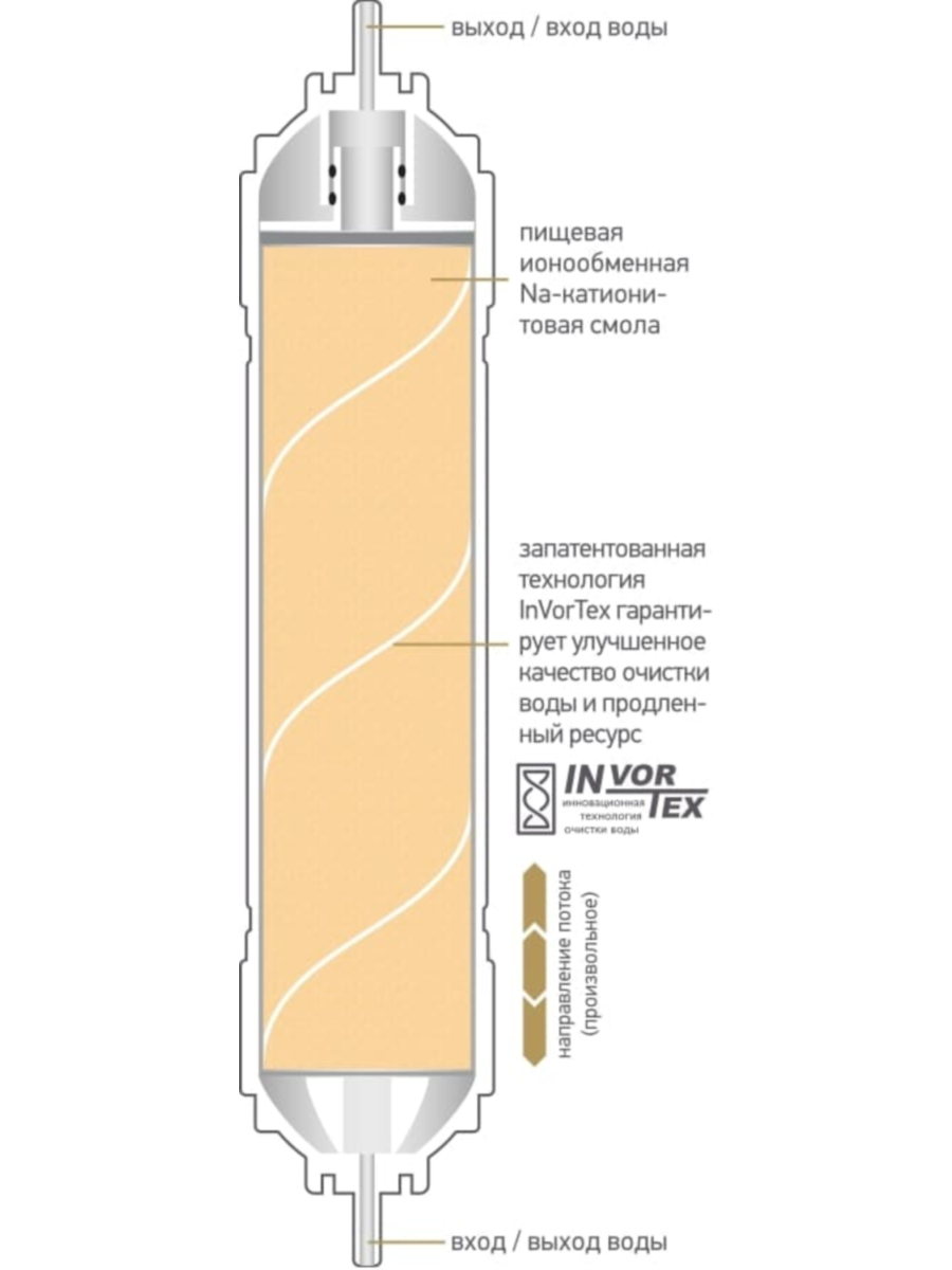- Изготовлен из ионообменной смолы пищевого класса, что обеспечивает безопасность и экологичность обработки воды.