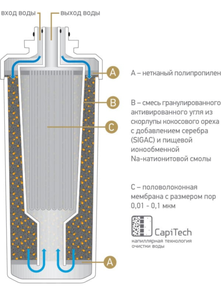 - Половолоконная мембрана обеспечивает ультрафильтрацию воды, задерживая загрязнения размером более 0.01 мкм, включая бактерии и вирусы;