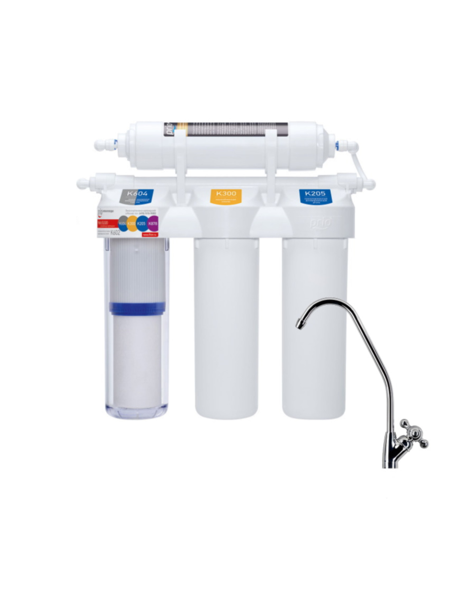 - На первом этапе комбинированный картридж K604, состоящий из вспененного полипропилена и гранулированного угля, удаляет из воды хлор, органические вещества и механические примеси крупнее 5 микрон (ресурс: до 2000 литров*).