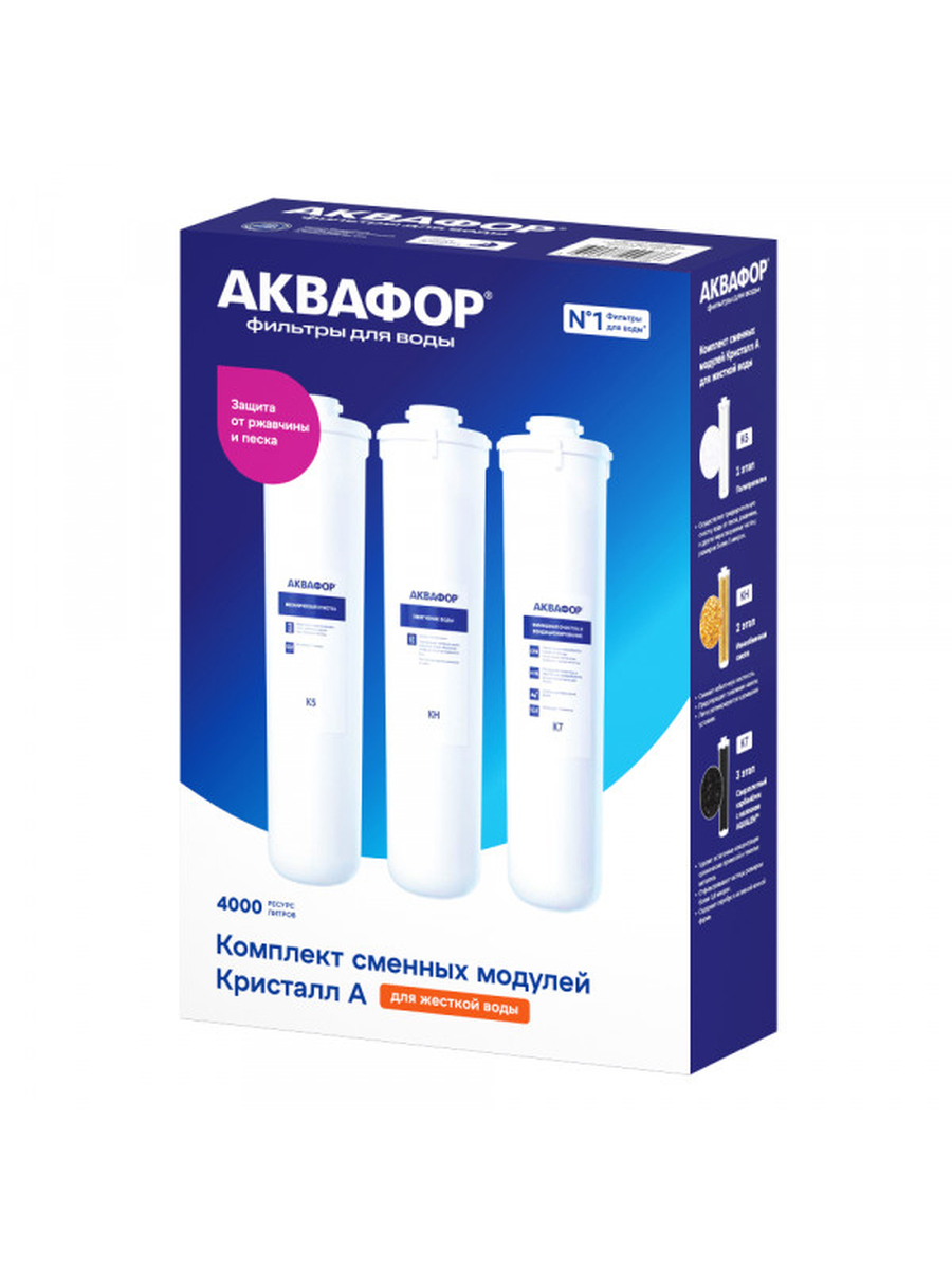 Представляем комплект сменных модулей Аквафор для системы очистки воды Кристалл А, предназначенный для использования в течение года. Оптимален для воды с низкой и средней жесткостью, обеспечивая глубокую очистку и эффективное умягчение. Модуль с ионообменной смолой подлежит регулярной регенерации, периодичность которой зависит от исходной жесткости воды и может колебаться от одного до трех месяцев. Хотите забыть о белом налёте и сохранить семейный бюджет? Выбирайте проверенную и надежную систему очистки воды для вашего дома.