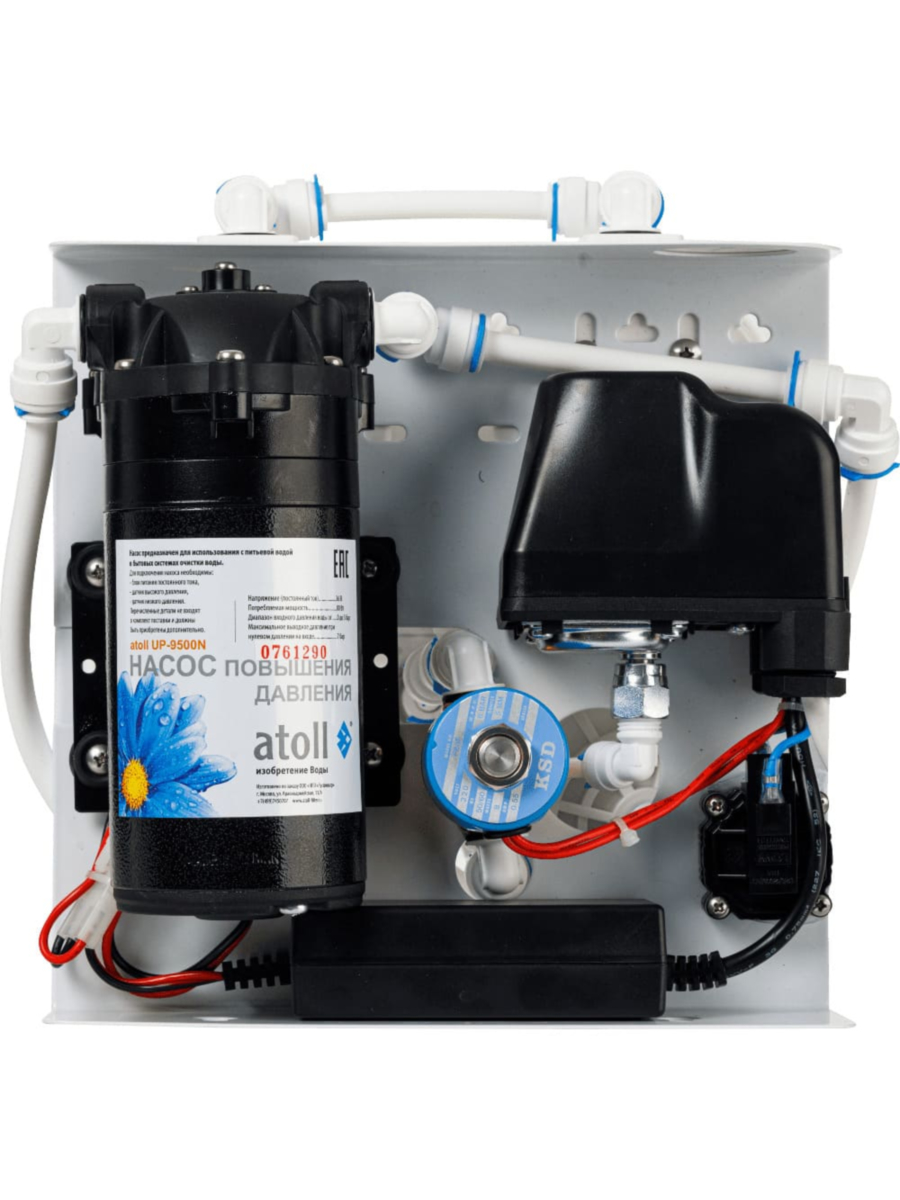 Система обратного осмоса atoll A-4400p STDA создана для мгновенного получения чистой питьевой воды Без промежуточного накопительного бака благодаря мощным компонентам - мембране производительностью 500 галлонов в день и усиленному насосу Водоотведение оптимизировано соотношение поступления к водоотведению 1 к 2 Насос включается автоматически при открытии крана и выключается при его закрытии Гидравлический удар исключён благодаря редукционному клапану Ограничивающее максимальное давление воды до 2.76 атм Входная линия оснащена трубкой увеличенного сечения 3/8” Вся арматура и кран для чистой воды входят в комплект.