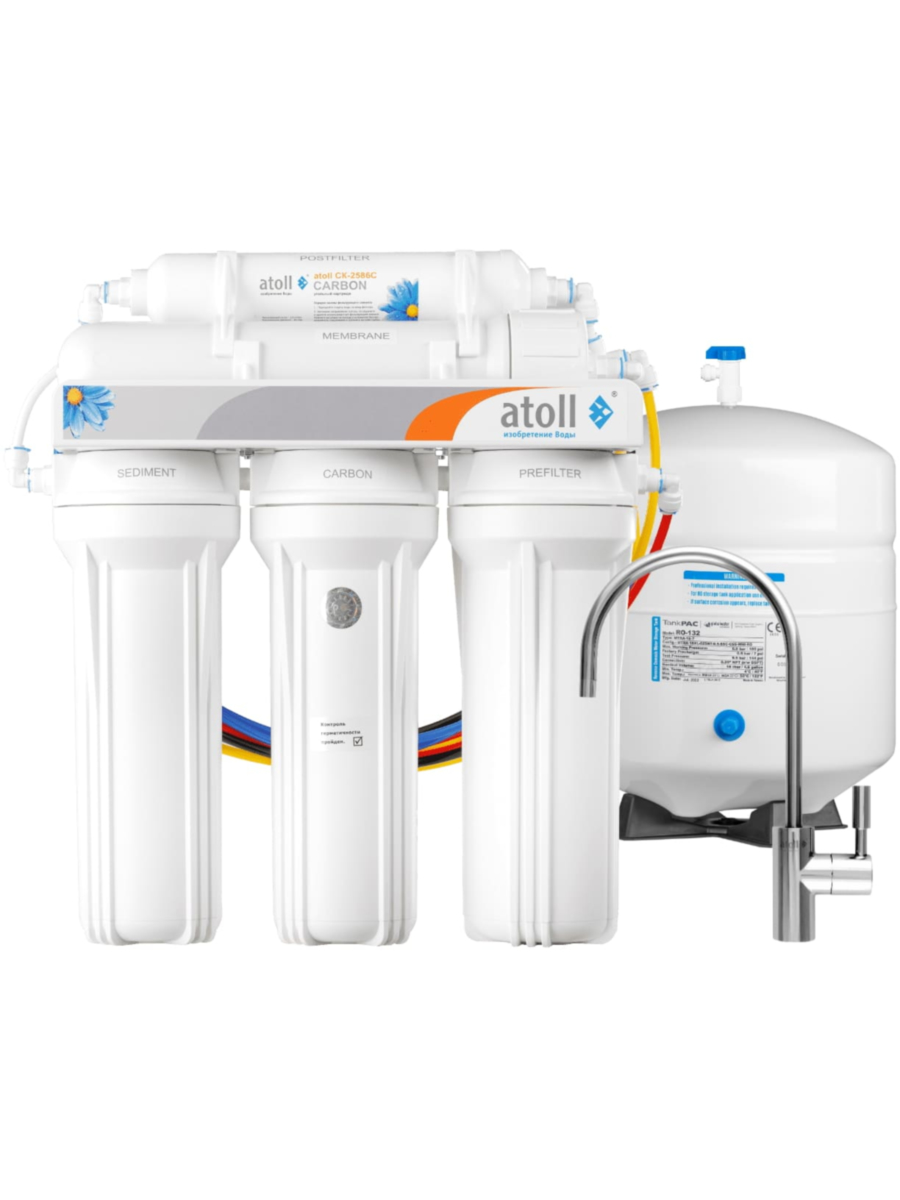 - Шаг пятый (угольно-сорбционный постфильтр atoll CK-2586C) - завершительная чистка воды от остатков хлора, неприятных запахов и привкусов.
