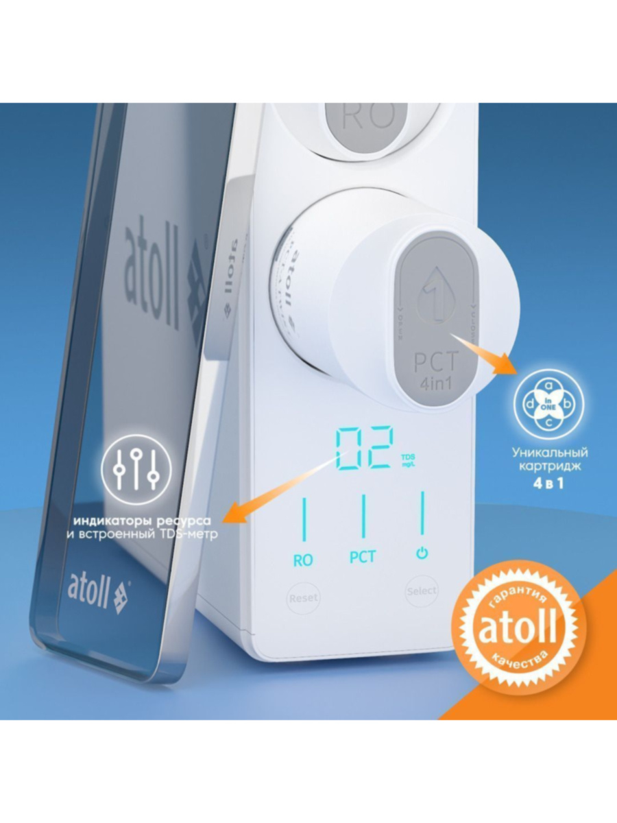 Основная стадия фильтрации - обратноосмотическая мембрана atoll TWIST RO-800 удаляет до 98% загрязнений обеспечивая полное удаление бактерий вирусов тяжелых металлов нефтепродуктов солей жесткости и прочих нежелательных примесей Размер отверстий мембраны составляет менее 0.0001 мкм.