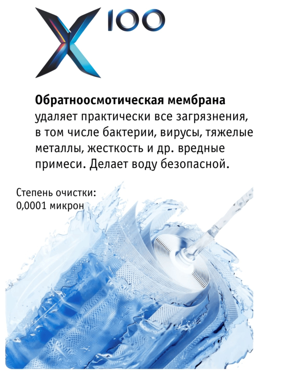 - Формирует обратный осмотический барьер, очищая воду от 98% растворённых и нерастворённых примесей размером свыше 0.0001 мкм. Избавляет от бактерий, вирусов, токсинов, тяжёлых металлов, нефтепродуктов и множества других загрязнений, присутствующих в обычной воде. Такая высокая степень фильтрации делает воду абсолютно безопасной для питья непосредственно из-под крана.