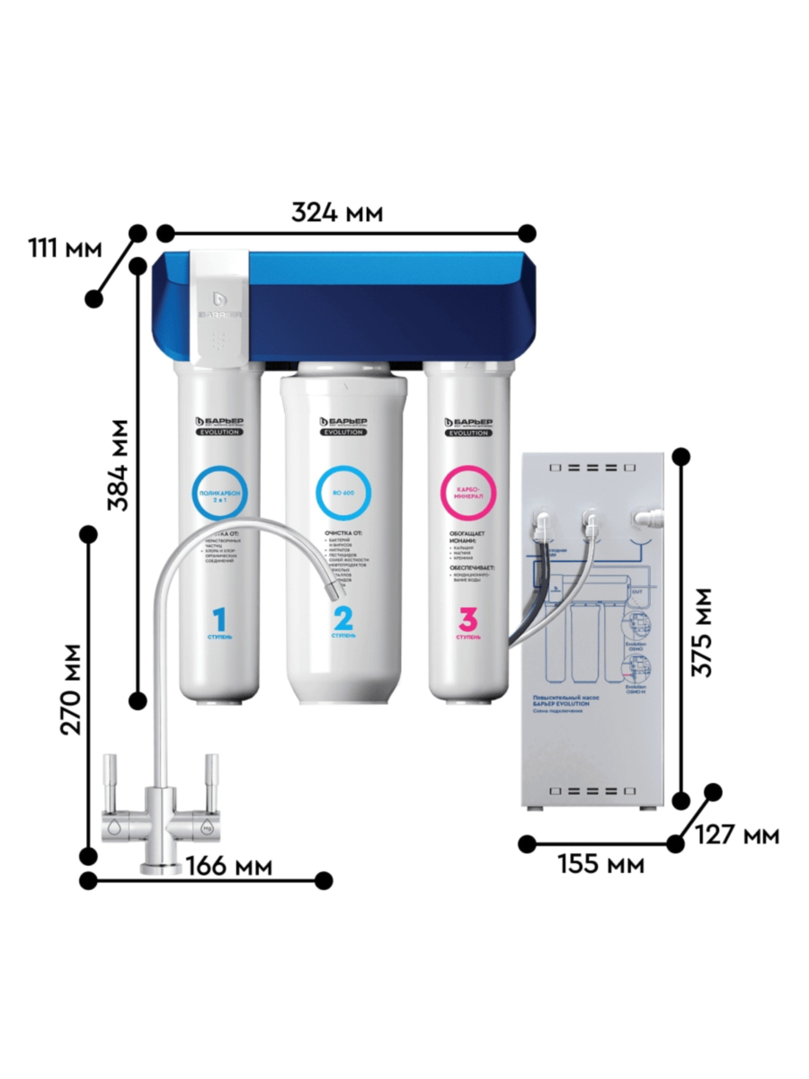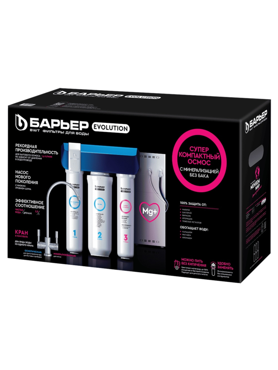 Barier Evolution OSMO M — это первая классическая система обратного осмоса от компании Барьер, оснащенная насосом и работающая без подключения накопительного бака. Отличается высокой производительностью и компактностью, прекрасно подходя для установки в квартирах и домах с ограниченными площадями.