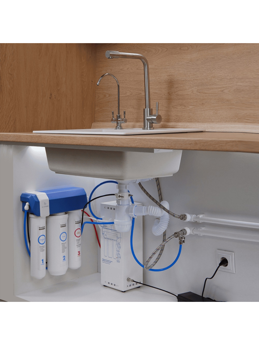- Оснащен малошумным насосом, обеспечивающим стабильную работу фильтра даже при низком давлении в магистрали (от 0.5 атм).
