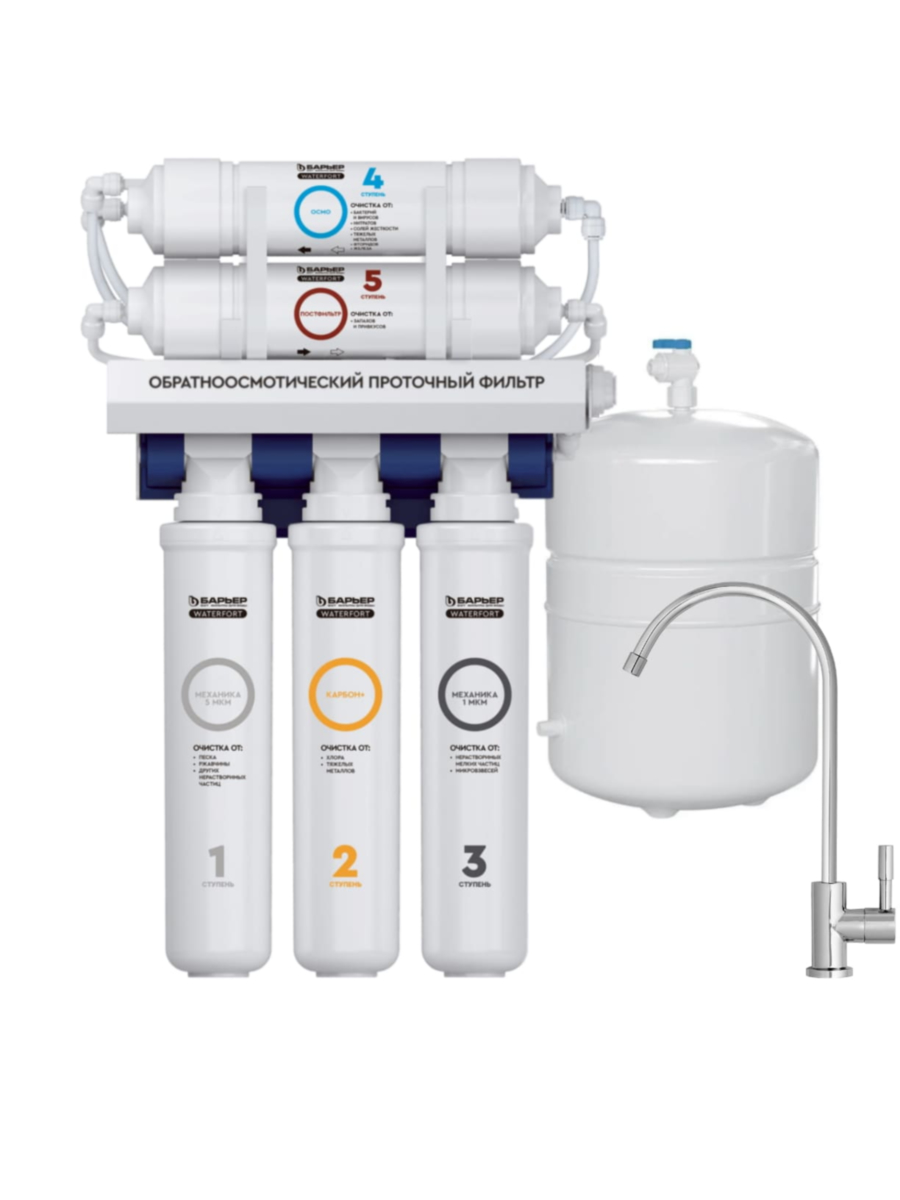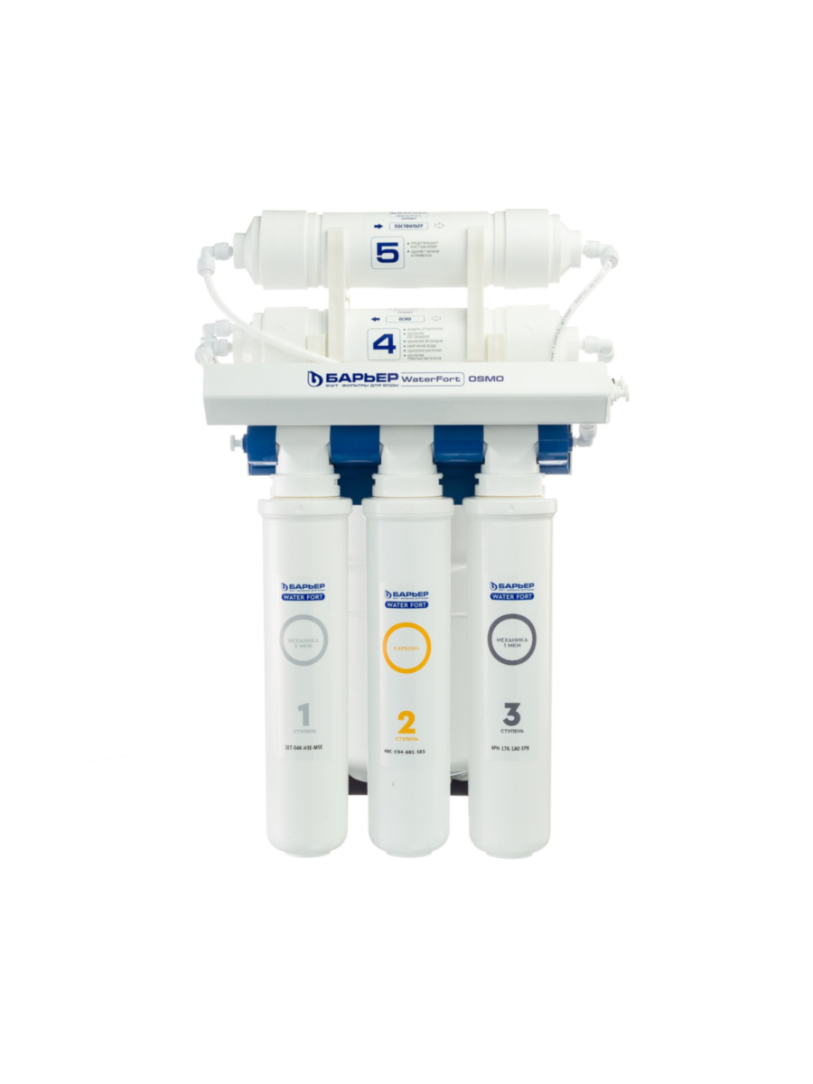Фильтр Барьер WaterFort Осмо — это 5-ступенчатая система фильтрации, оснащенная обратноосмотической мембраной с производительностью 75 GPD, обеспечивающая эффективное удаление вредных примесей и создание чистой питьевой воды.