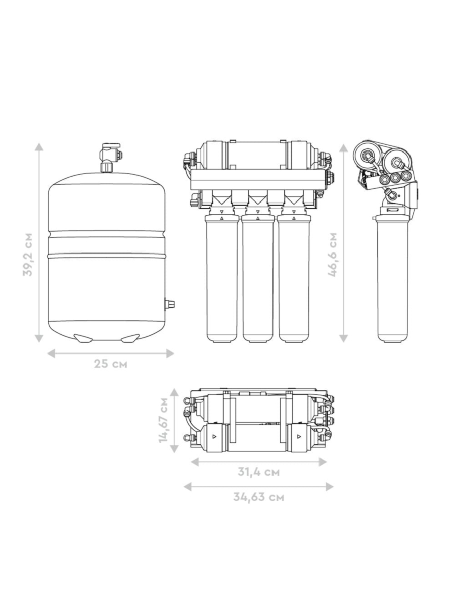 - Комплектуется накопительным баком объемом до 8 литров и краном для питьевой воды, обеспечивая бесперебойную подачу чистой воды.