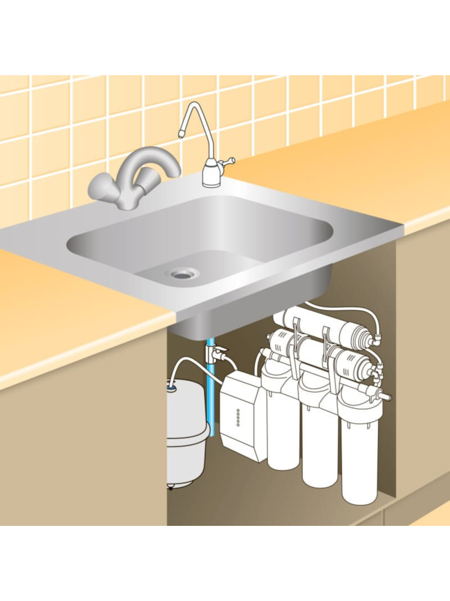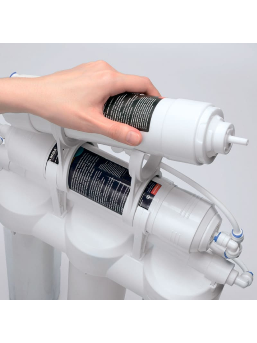 - Система оснащена комбинированным постфильтром, который одновременно кондиционирует и минерализует воду, возвращая важные микро- и макроэлементы, потерянные в процессе обратного осмоса.
